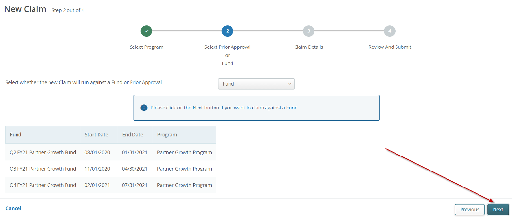 - In the following screen click Next, since the claim will be submitted against a fund not a Prior Approval (PA).