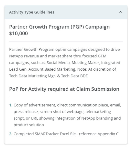 All Partner Growth Program (PGP) campaign selections will be bound by the Tech Data/NetApp Marketing Development Funds (MDF) Guidelines. Partners will be responsible to manage Proof of Performance for MDF in accordance to current Tech Data/NetApp MDF Guidelines, timelines and claim/audit processes. Failure to follow MDF Guidelines will result in partner’s termination from PGP.
